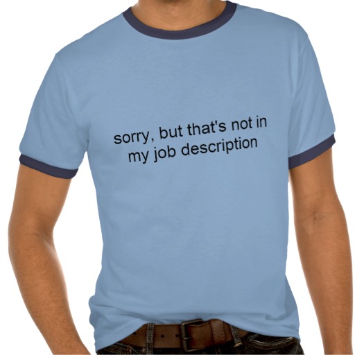 In this era of sensitivity to whose rights are being stepped on by whom, many workers are acutely aware of what their jobs do and do not require of them. It’s an old joke when the maid says, “I don’t do windows.” But it’s not such a joke when an employee says to the boss, “It’s not my job to get your coffee.” Or “I’m not supposed to empty the trash at closing.” Or, “I wasn’t hired to take flak from a customer.”